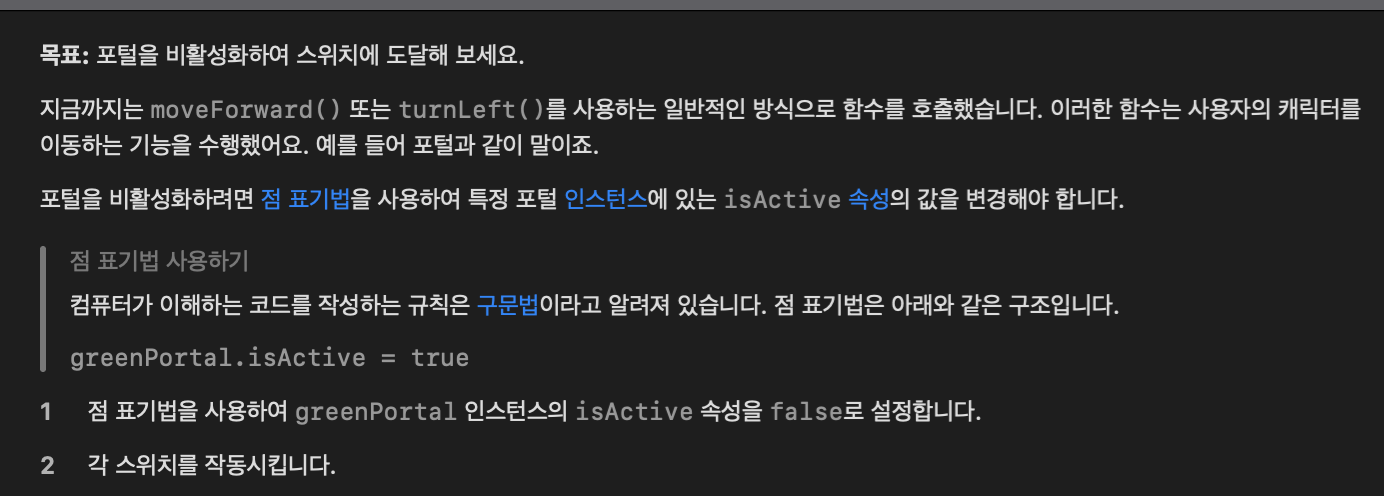 var ruby = 0 var switchNum = 0 while ruby == 0 || switchNum != ruby{ if isOnGem { collectGem() ruby += 1 }else if isOnClosedSwitch{ toggleSwitch() switchNum += 1 } if isBlocked{ turnRight() } moveForward() } 코드 설명 1. 먼저 보석과 켜진스위치 변수를 선언하고 0값을 준다. var ruby = 0 var switchNum = 0 2. 보석과 켜진스위치 개수가 같으면 반복문이 끝나도록 하고, 처음에 보석과 켜진 스위치 개수가 0으로 반복문이 실행이 안되기 때문에 보석이 0일때도 포함시켜 한다. ( OR 연산자를 사용했다.) while ruby..